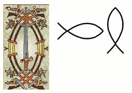 That annoying fish symbol the Christians use has also been stolen and corrupted. It is called a "yoni" and the Christians turned it on its side. It is really a vagina and its correct position is seen here at left. The yoni is a very ancient symbol and can be seen in many old decks of Tarot cards, as is pictured here.