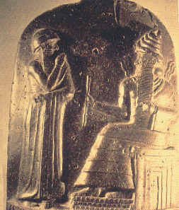 Below is a photo of the basalt stele showing the Sumerian Sun God Shamash giving Hammurabi the tablet listing the laws. "Shamash" is also known as "Azazel," the leader of the so-called "Fallen Angels," the "Igigi" Nordic extra-terrestrials who took human wives.